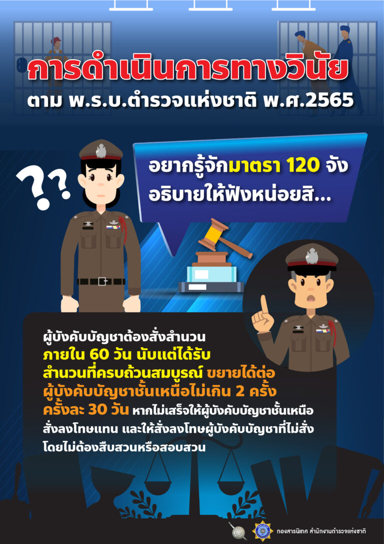 การดำเนินการทางวินัย ตาม พ.ร.บ.ตำรวจแห่งชาติ พ.ศ.2565 มาตรา 120 ผู้บังคับบัญชาต้องส่งสำนวนภายใน 60 วัน นับแต่ได้รับสำนวนที่ครบถ้วนสมบูรณ์ – ขยายได้ต่อผู้บังคับบัญชาชั้นเหนือไม่เกิน 2 ครั้ง ครั้งละ 30 วัน – หากไม่เสร็จให้ผู้บังคับบัญชาชั้นเหนือสั่งลงโทษแทน และให้สั่งลงโทษผู้บังคับบัญชาที่ไม่สั่ง โดยไม่ต้องสืบสวนหรือสอบสวน