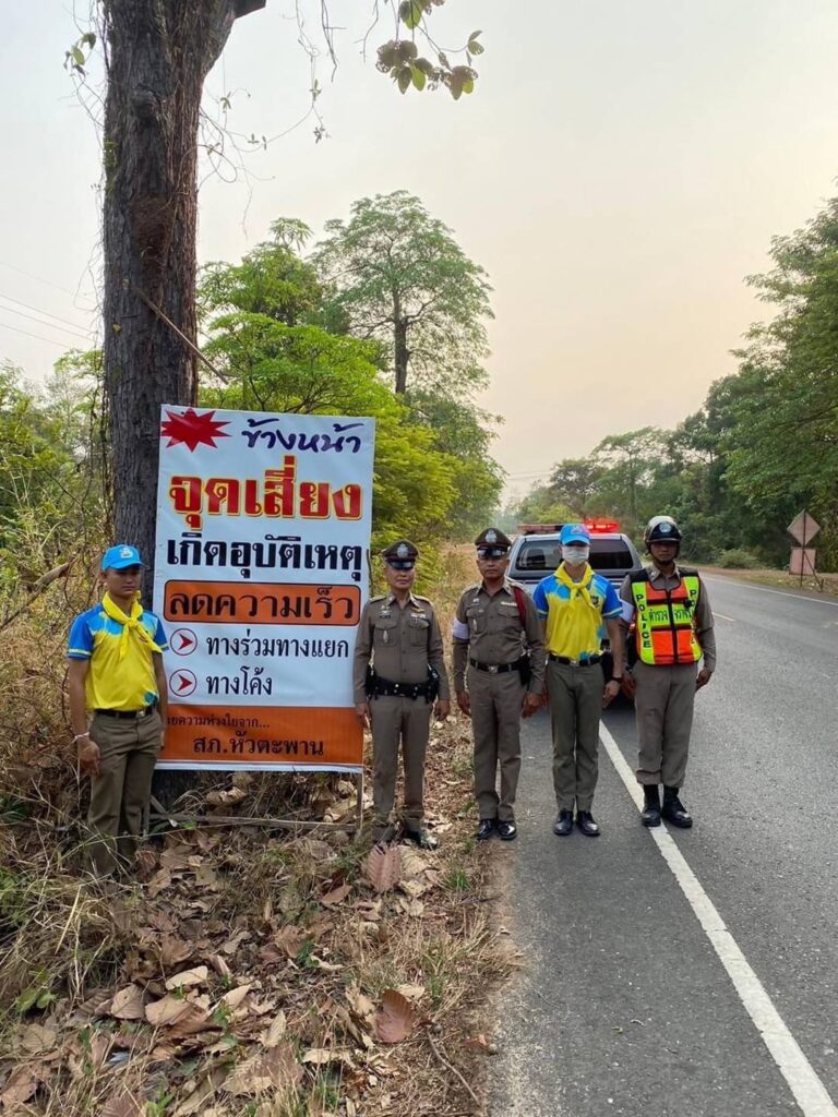 สวป.สภ.หัวตะพาน พร้อมด้วย ร้อยเวร60 และ ชุดจราจร,จิตอาสา ว.4 ติดตั้งป้ายประชาสัมพันธ์/ป้ายเตือนบริเวณจุดเสี่ยง และเส้นทางที่มีรถสัญจรไปมาจำนวนมาก