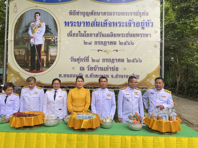 วันนี้ (28 ก.ค.66) เวลา 07.00 น. พ.ต.อ.อลงกรณ์ คลังเงิน ผกก.สภ.หัวตะพาน ร่วมพิธีทำบุญตักบาตรถวายพระกุศล เนื่องในโอกาส วันเฉลิมพระชนมพรรษาพระบาทสมเด็จพระเจ้าอยู่หัว 28 กรกฎาคม 2566 ณ วัดบ้านเก่าบ่อ ตำบลหนองแก้ว อำเภอหัวตะพาน จังหวัดอำนาจเจริญ โดยมี นายประหยัด คุณมี นายอำเภอหัวตะพาน เป็นประธานในพิธี Previous Next